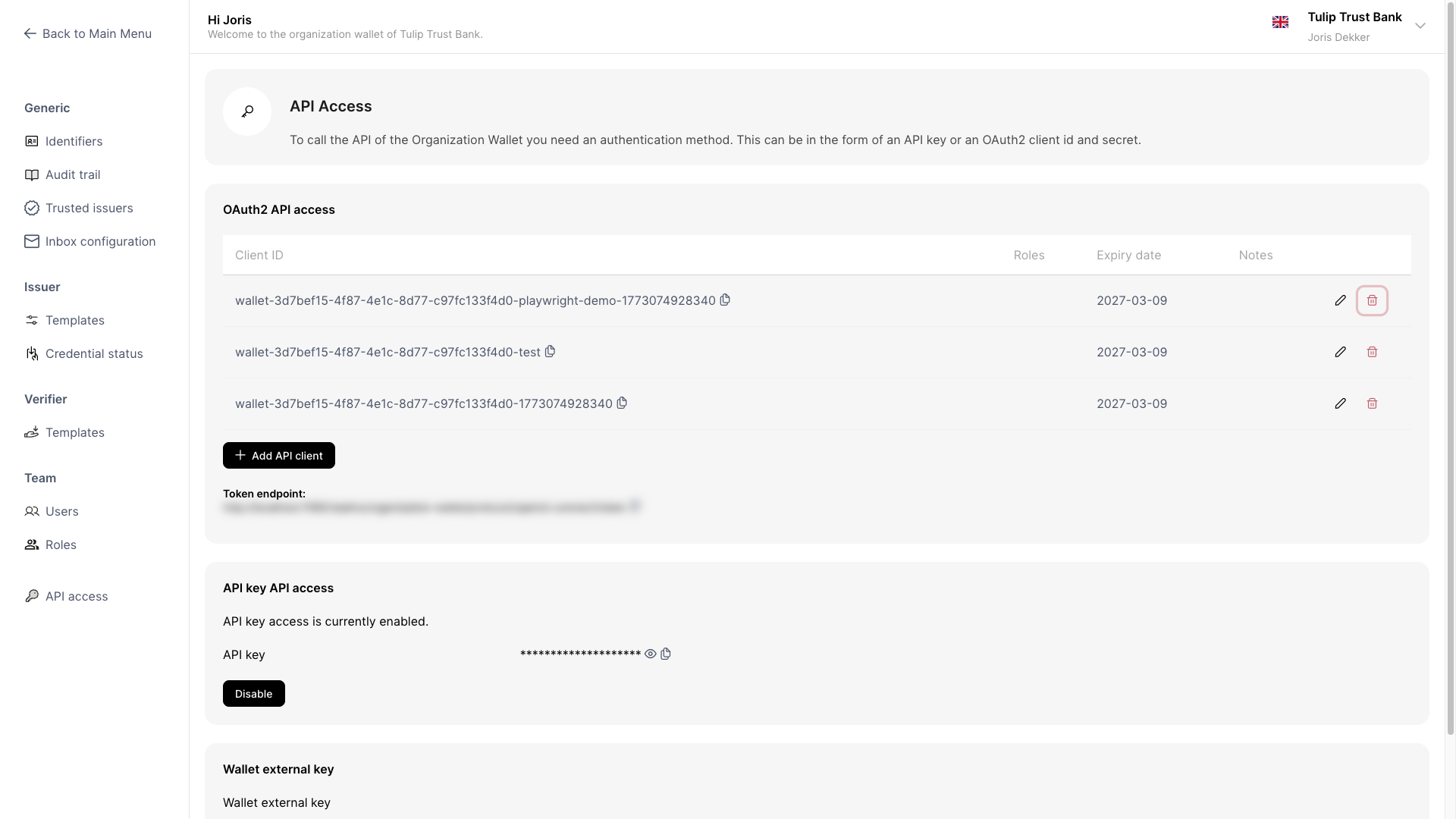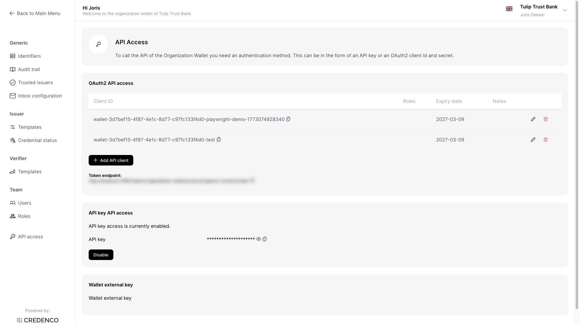 The API Access screen lets administrators configure OAuth client IDs that allow external systems to authenticate against your wallet using the OAuth 2.0 Client Credentials flow.